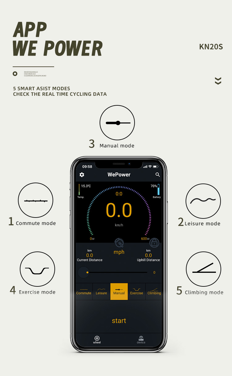 The core advantage of the KN Series ebike conversion kit lies in its seamless blend of intelligence and simplicity. The assist system is based on the speed, acceleration, the slope of the road, and the assist level that you set in the APP or the optional wireless display, calculating out the power you need. The motor will kick in when the speed reaches 5km/h. When you make a little bit more effort on pedaling, the system will sense the increase of the speed and help you with more power. On contrary when you brake, the system can sense the decrease of speed and reduce the power or shutdown the motor. And thanks to the gyroscope built in the controller, it will also increase the power when you go uphill and shut down the motor when go downhill.