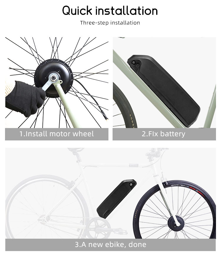 In terms of practical operation, the KH series ebike conversion kit follows a user-friendly design philosophy. The complete ebikekit conversion system includes the bicycle hub motor, ebikeling battery and controller. The installation only requires replacing the electric front wheel and connecting the battery&controller—no welding, no disassembly of the drivetrain, and no modifications to the bike’s structure. For riders who already own a beloved mountain bike, this is not “changing the bike,” but upgrading it.