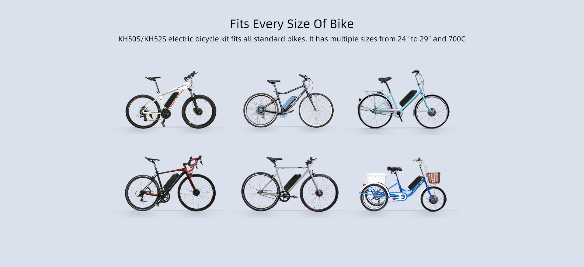 The KH series swytch bike kit adopts an electric hub motor structure and is compatible with 16/20/24/26/27.5/700C/28/29-inch bicycles, allowing users to upgrade without altering the bike’s original frame. The entire lineup offers three options—36V 250W, 36V 350W, and 48V 500W. Among them, the 48V 500W version KH52S electric bike conversion kit delivers up to 70 N·m of maximum torque, ensuring stable and powerful output even on continuous climbs, heavy-load off-road rides, or other challenging terrains. It brings a constant stream of power to mountain riding, making the struggle of “not being able to climb the hill” a thing of the past.